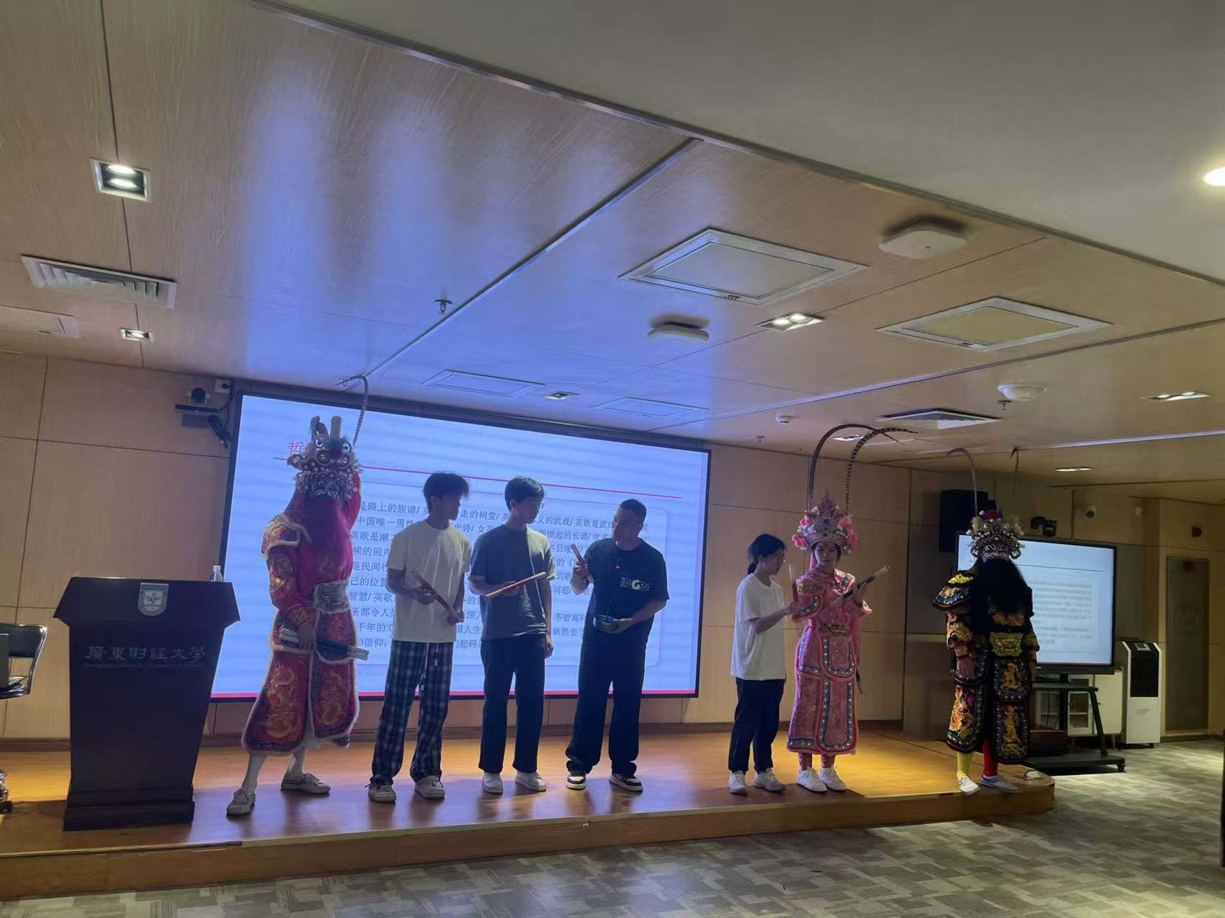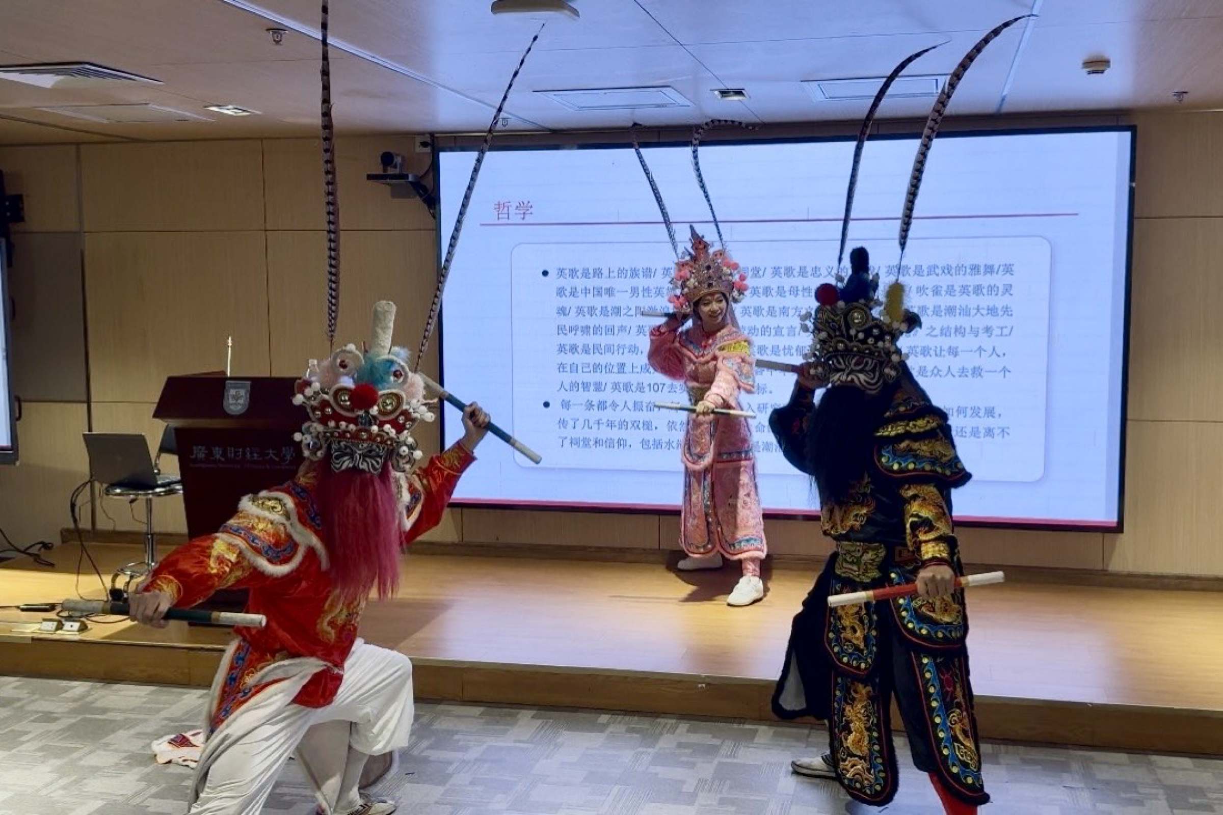 讲座中,郭小东教授以《英歌的四种讲述》为题,从巫傩遗制、周礼仪轨、水浒忠义、雅舞精神四个维度,系统解读英歌舞的历史脉络、文化内涵与哲学意蕴。通过深度讲解,郭小东教授带领同学们通过表演表象,读懂英歌舞承载的历史记忆、民俗信仰与人文精神。