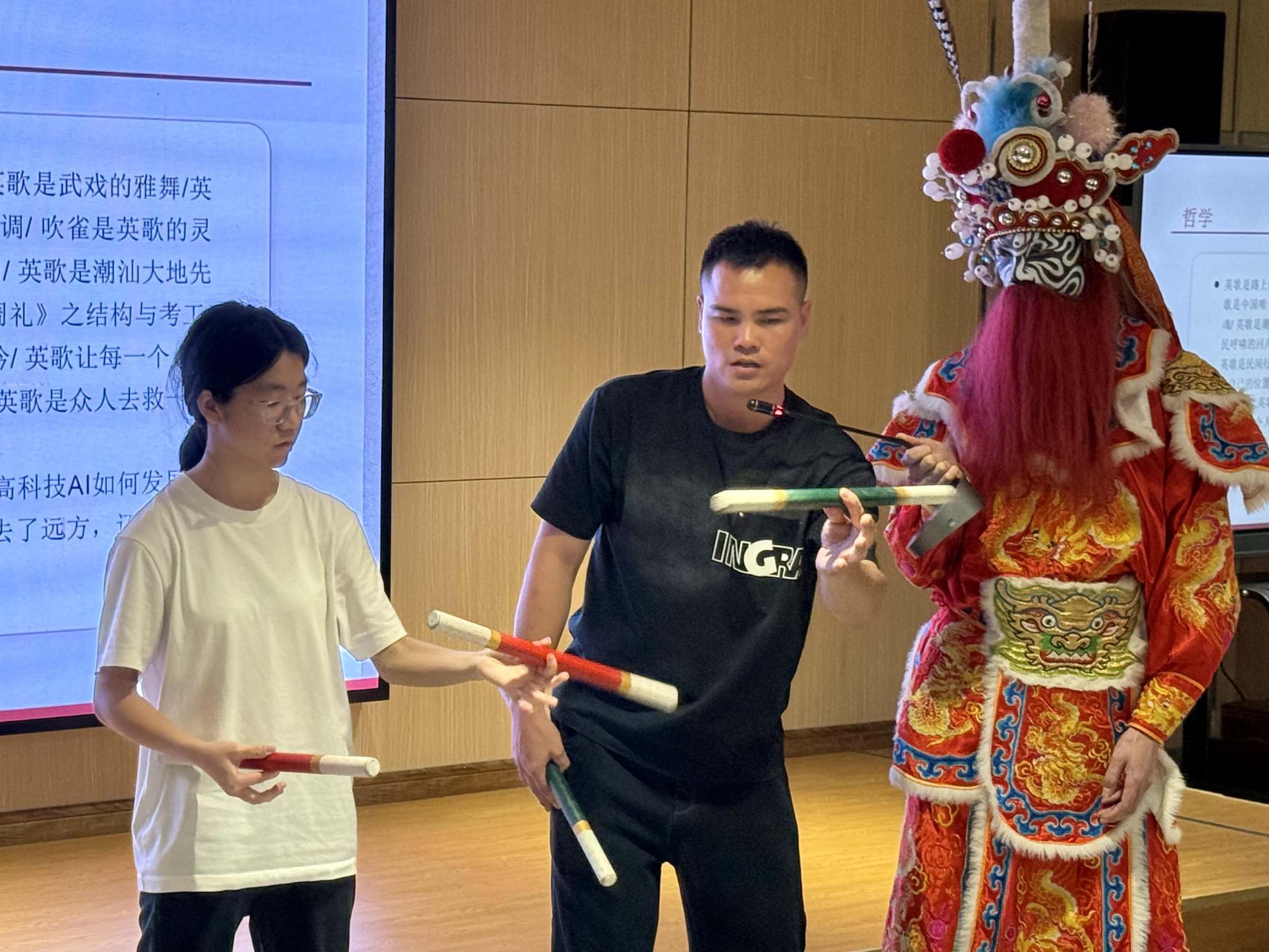 为了让大家沉浸式体验英歌舞神韵,英歌舞队员现场进行展示。头槌(天猛星・秦明)、二槌(天勇星・关胜)气势刚劲、步法沉稳,穆桂英角色英姿飒爽、气韵生动,完整呈现英歌舞的经典人物范式与表演精髓。展演结束后,英歌舞队员还与同学们进行互动,现场教学英歌舞的基础技法,让大家在亲身体验中感受非遗技艺的独特魅力。