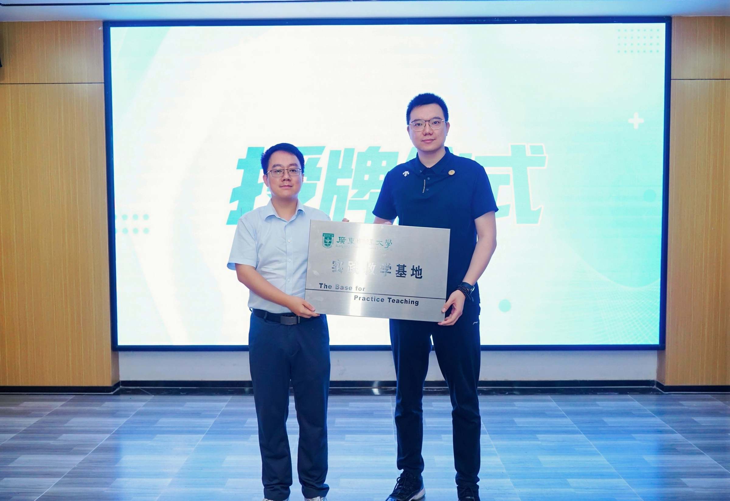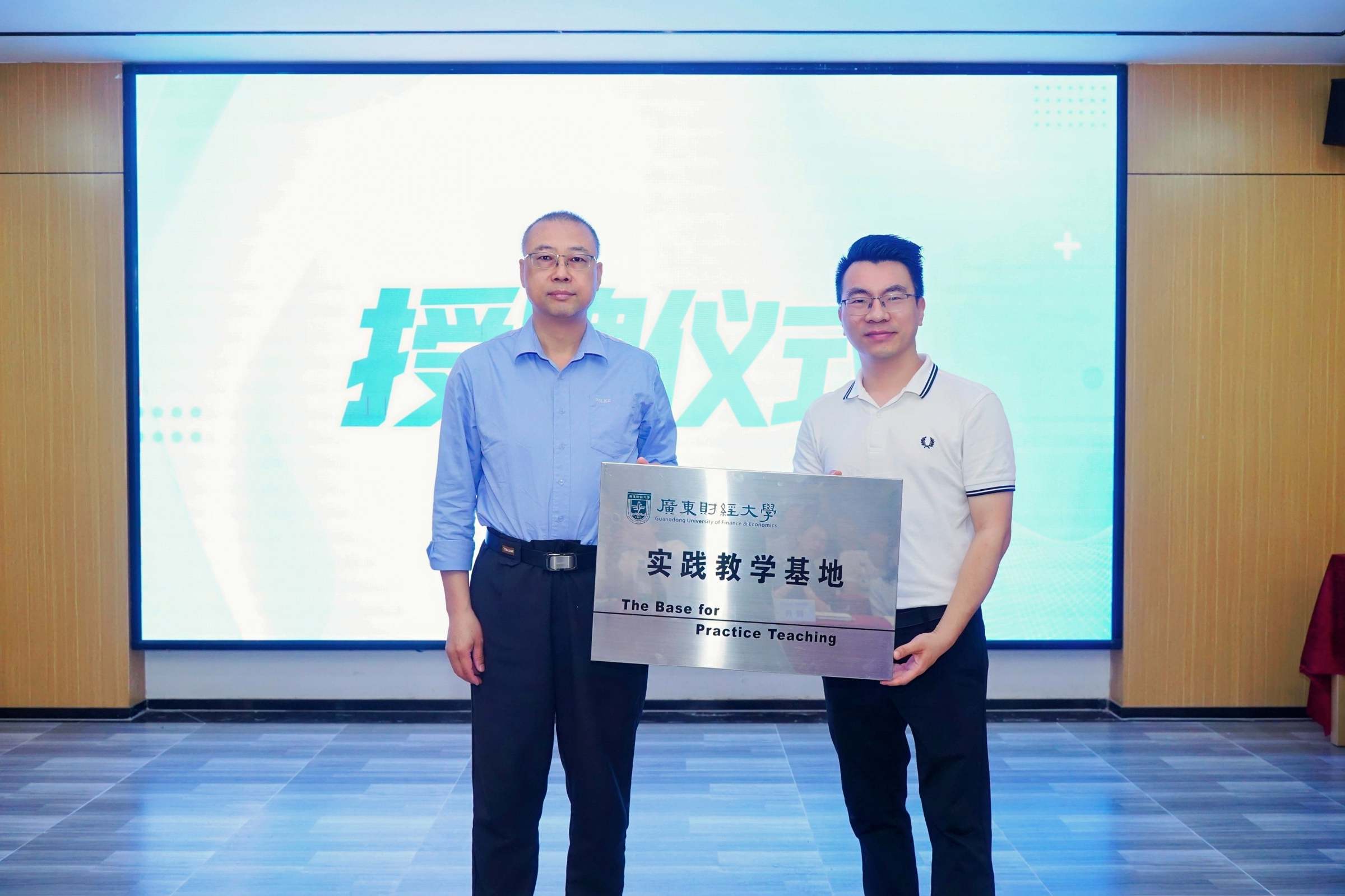广东财经大学大数据与人工智能学院副院长胡建军、国际商学院副院长罗任飞分别向惠州市禹链科技有限公司、广东超凡信息科技有限公司授予“广东财经大学实践教学基地”牌匾。