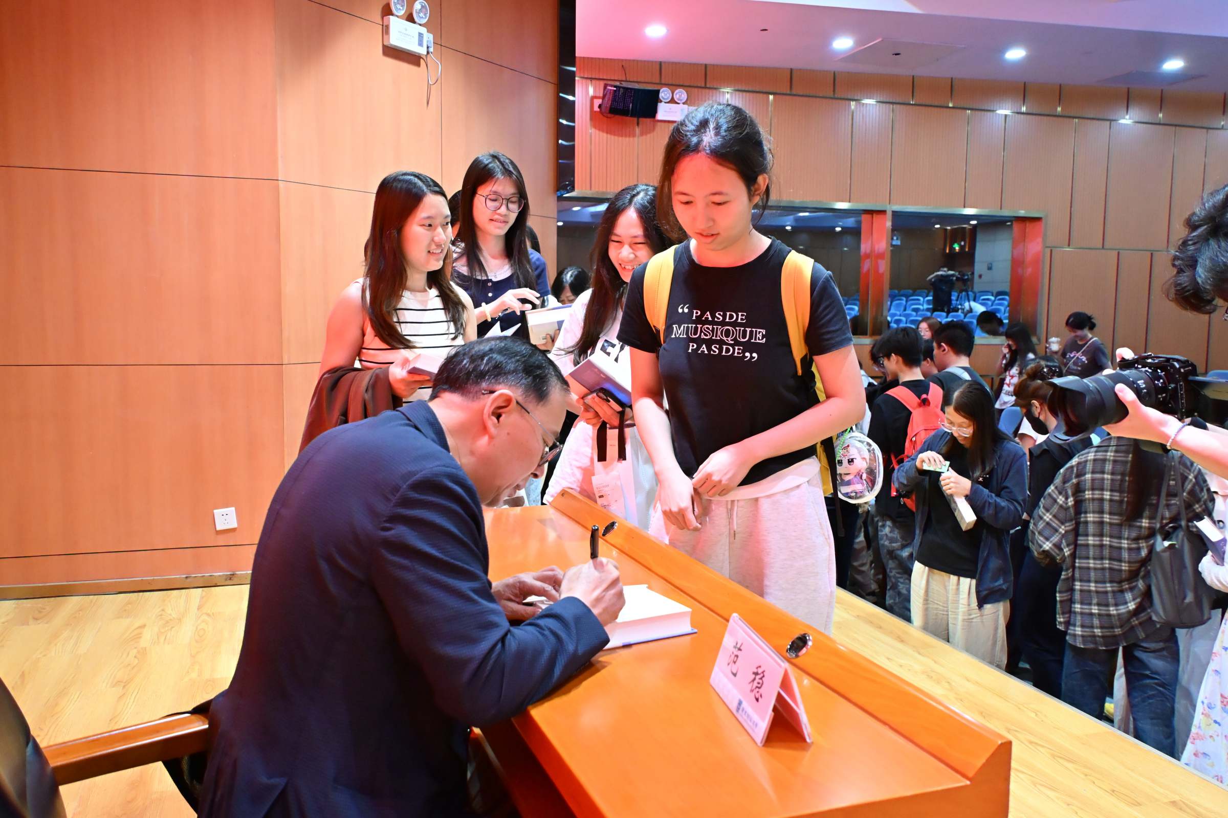 互动环节中,学生围绕创作方法、AI对文学的冲击、身份认同与精神成长等内容提问。两位嘉宾耐心解答,真诚分享。活动尾声,范稳为师生签名赠书。