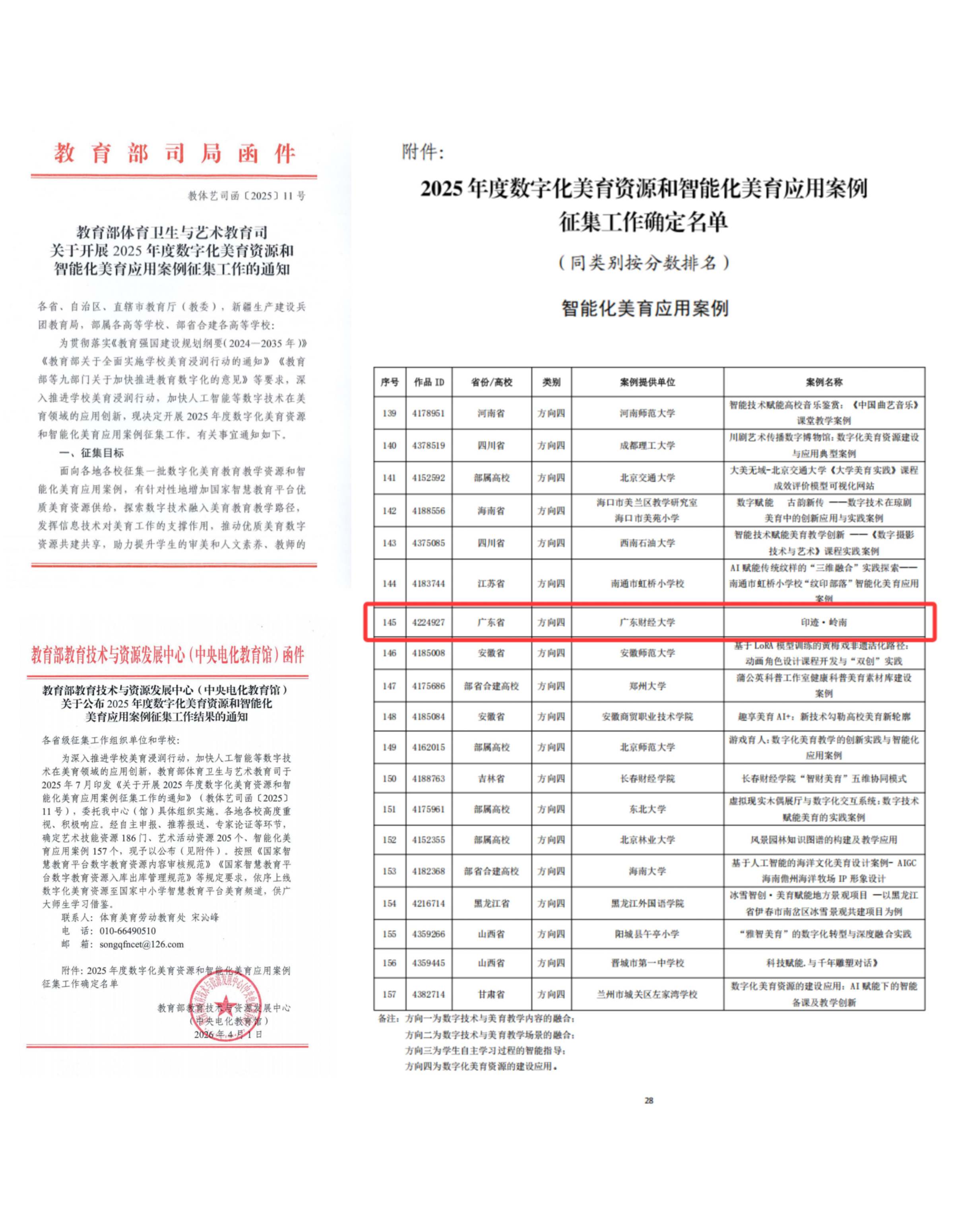 近日,教育部正式公布2025年度数字化美育资源和智能化美育应用案例征集结果。我校提交的项目《印迹·岭南》在激烈竞争中脱颖而出,成功入选。