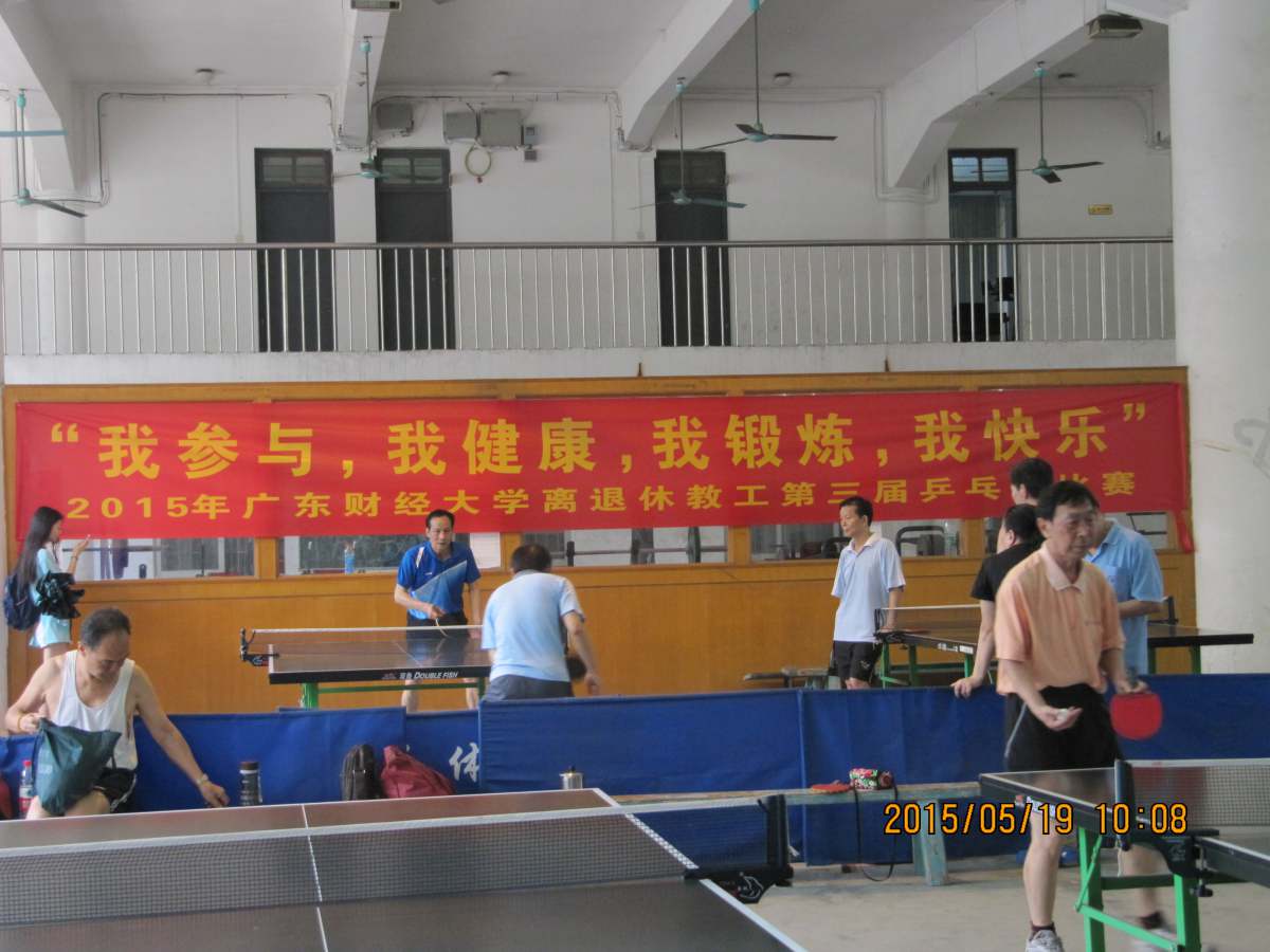 为丰富和活跃我校离退休教职工的文体生活,推动老年教工乒乓球运动广泛开展,5月19日以“我参与,我健康,我锻炼,我快乐”为主题的2015年广东财经大学离退休教职工乒乓球比赛在广州校区体育馆举行。