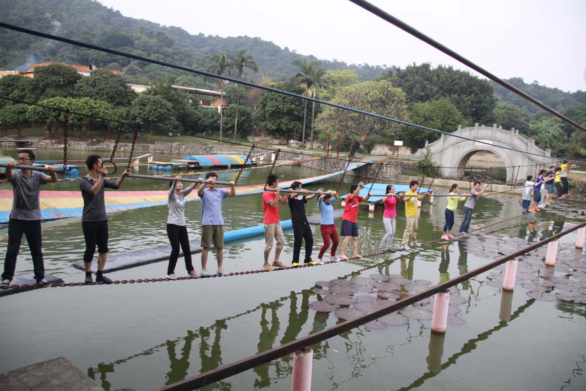 “飞龙在天!虎虎生威!”飞虎队声势浩大。“电闪雷鸣!劈!劈!劈!”闪电队不甘示弱,激情洋溢地展示团队风采。“破冰训练”后,大家被随机分成两队,兴致勃勃地投入到“竖网桥—悬空摇摆”、“空中钢丝—极速圆木”、“鼓浪屿—平安桥”、“踏笼飞渡”、“孤岛求生”等多个项目中。其中,在“竖网桥—悬空摇摆”中,闪电队一名队员在跨度长达40米之宽的高空竖网中间,双手紧握绳索却迈不开腿。在进退两难之时,双方队员主动伸出援手,回到竖网,保护协助他完成项目。在“踏笼飞渡”以及个人自由挑战等水上项目中,有的队员多次落水,却不断挑战,坚持不懈。大家克服畏难心理,凭借团结协作、互助互爱的精神,闯过一道道险关。