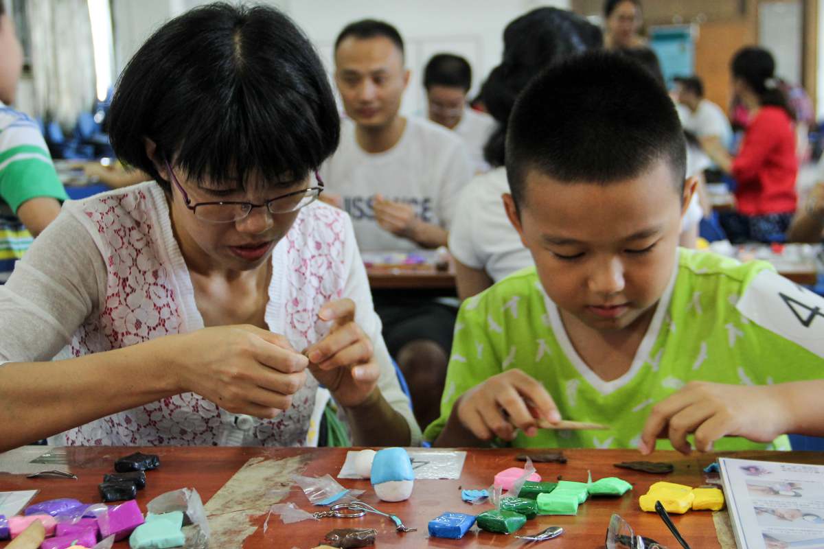 本次DIY亲子活动旨在庆祝“六一”儿童节的同时,增进教职工与子女之间的情感交流,拓宽孩子们的活动空间。活动分两组进行。第一组是陶艺DIY,由艺术学院安排学生引导家长与小孩按编号分区域制作不同软陶手工作品,组织制作不同的手机链、钥匙扣等。第二组是体验艺术学院产品玩具,由艺术学院提供不同的益智玩具,由产品系教师和学生引导共同搭建启智造型作品。艺术学院分工会主席、广东陶瓷艺术大师熊青珍老师和产品系主任金滨浩老师分别就本次活动的陶艺品的制作作了介绍。艺术学院15级产品设计学生在现场进行指导,为小朋友和家长提供帮助。