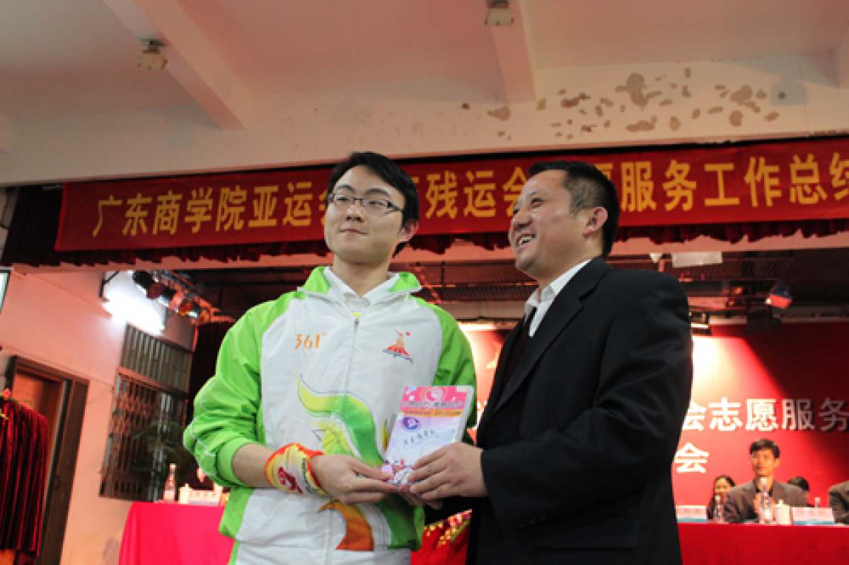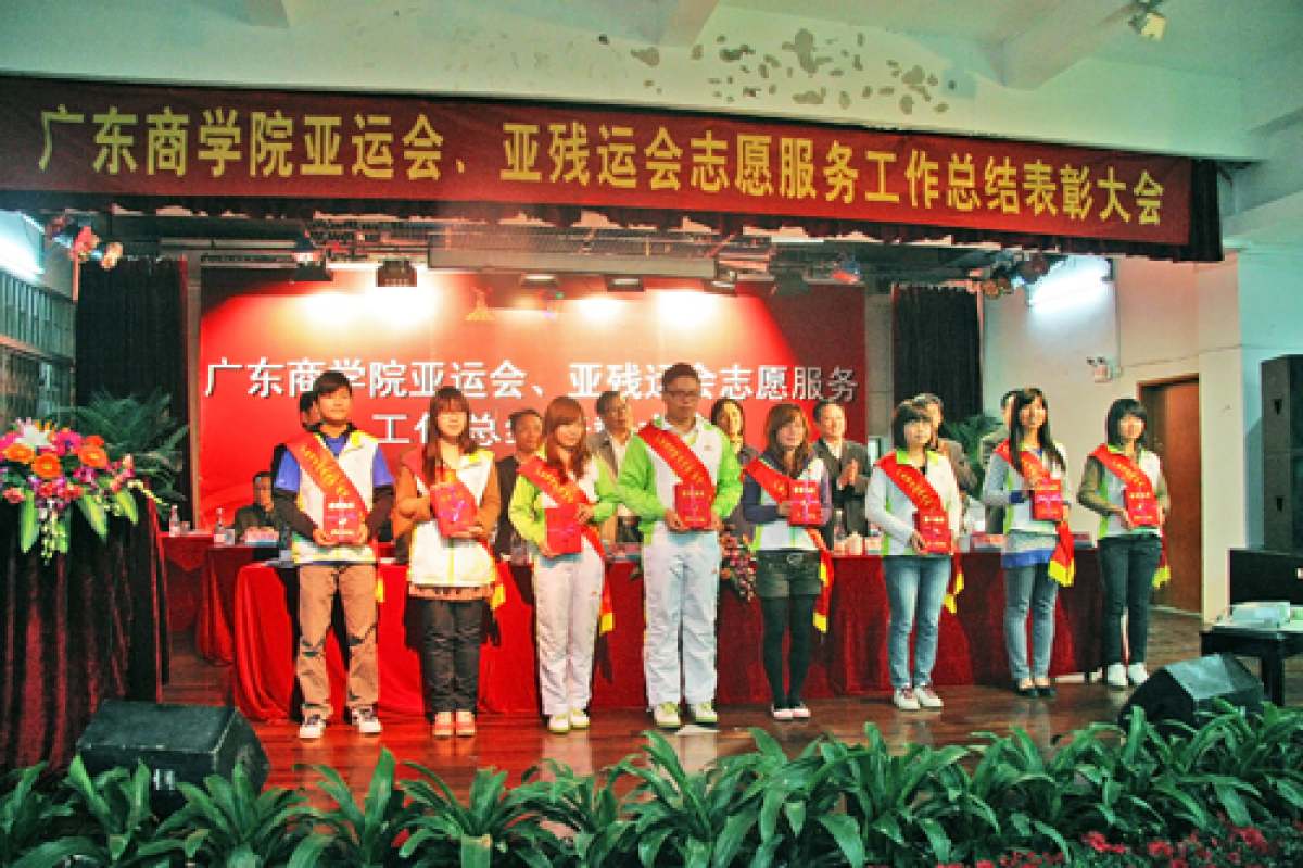3月30日下午,广东商学院亚运会、亚残运会志愿服务工作总结表彰大会在校本部学生活动中心召开。会议总结了亚运、亚残运会志愿服务工作,表彰了一批先进集体和优秀个人。团省委副书记曾颖如,校党委书记程飚,副校长袁新满、于海峰,各学院、相关部门领导以及400名优秀志愿者代表出席大会。
