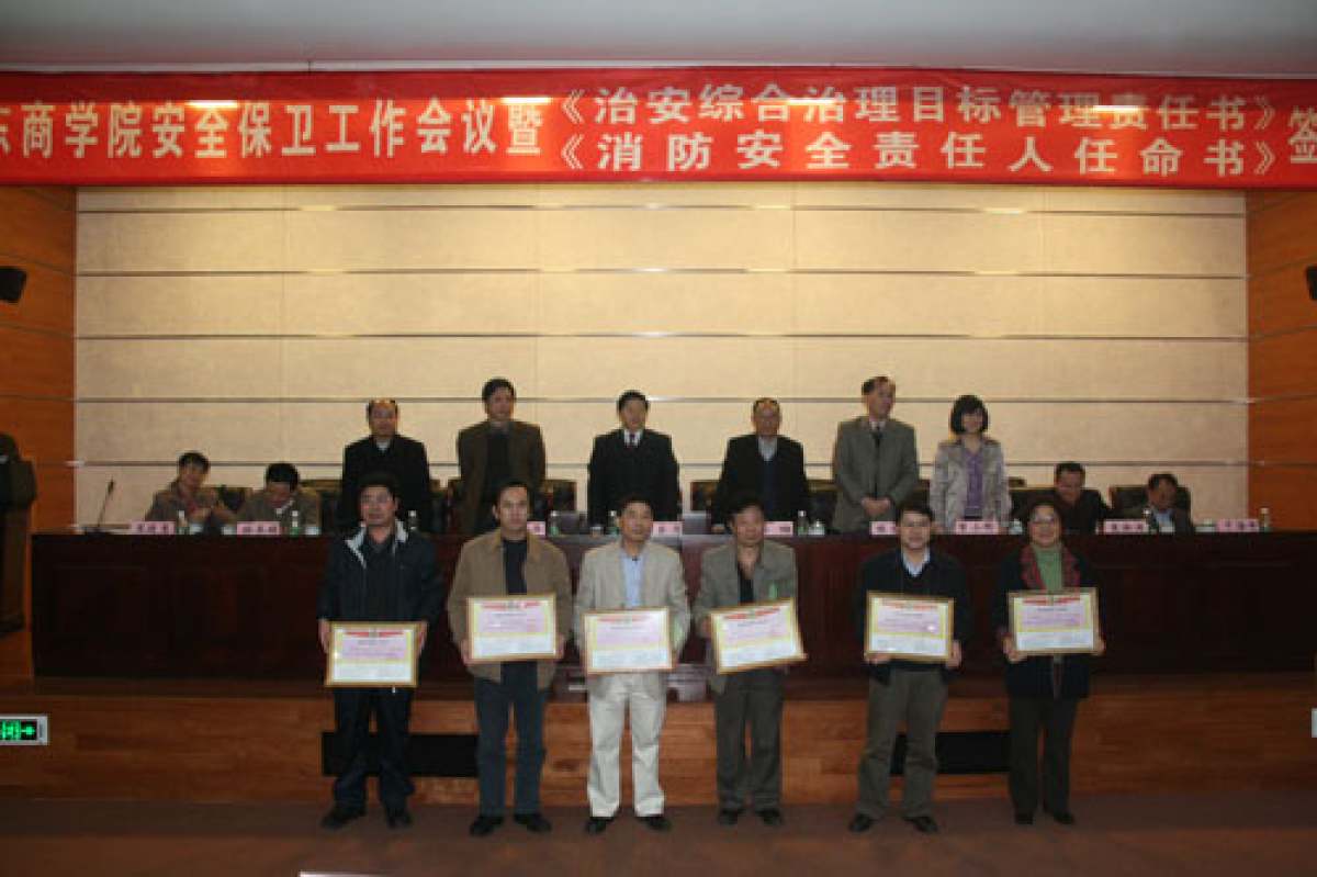 会上,副院长袁新满代表学校作了安全保卫工作报告,总结了2008年学校安全保卫取得的成绩和存在问题,布置了2009年学校安全保卫工作的主要任务。学校党政安全第一责任人院党委书记杨维、院长吴家清与各单位党政安全第一责任人签订《广东商学院治安综合治理目标管理责任书》。院领导为各单位颁发了《消防安全责任人任命书》。