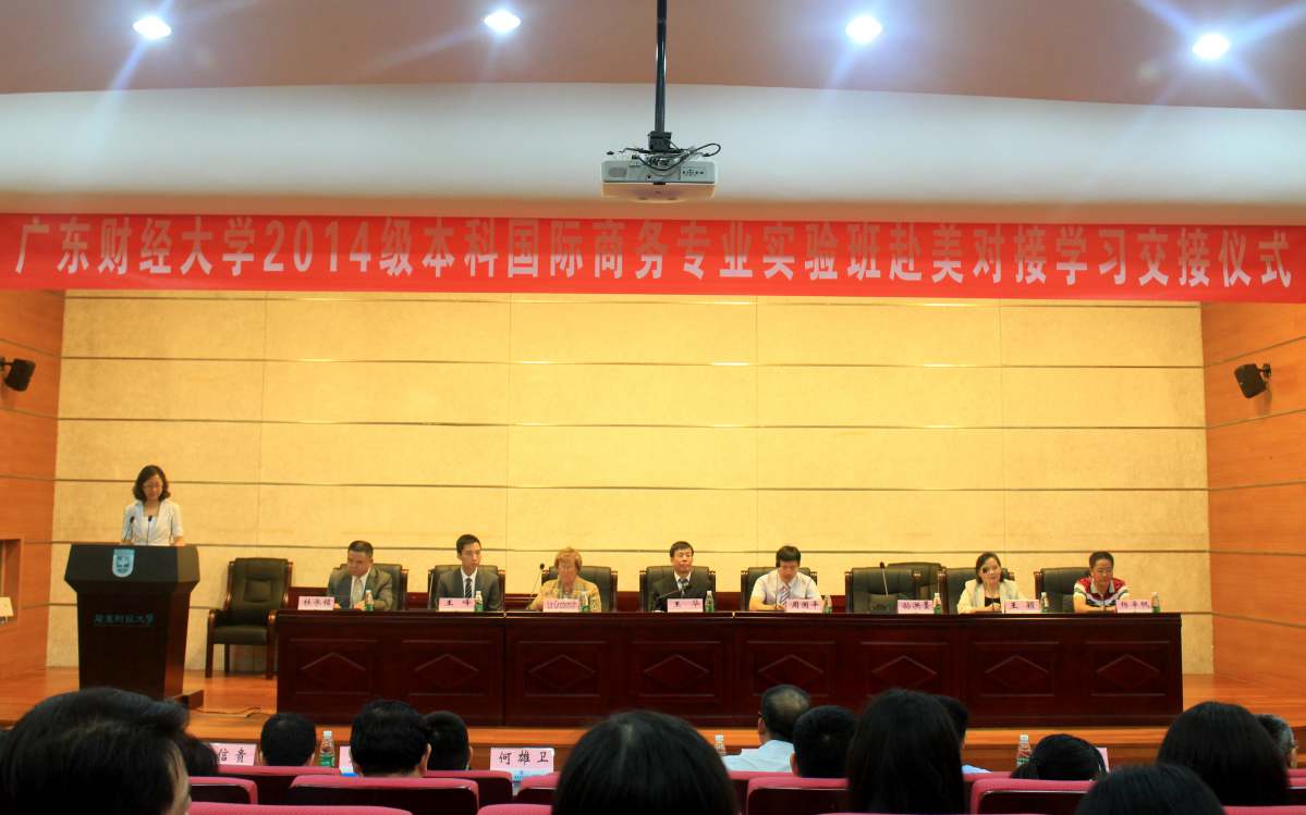 6月22日下午,学校在综合楼408会议厅举行了“2014级本科国际商务专业实验班赴美对接学习交接仪式”。教育部中国教育国际交流协会主任孙洪墨,教育部中国教育国际交流协会“中美人才培养计划”1+2+1项目总监王颖,广东省教育厅交流合作处副处长周国平,美国北亚利桑那大学原副校长、现任校长国际事务高级顾问Liz Grobsmith,美国北亚利桑那大学国际教育中心中国事务副主任王峰,以及首届国际商务专业实验班的全体学生及其家长出席仪式。副校长杜承铭主持仪式。
