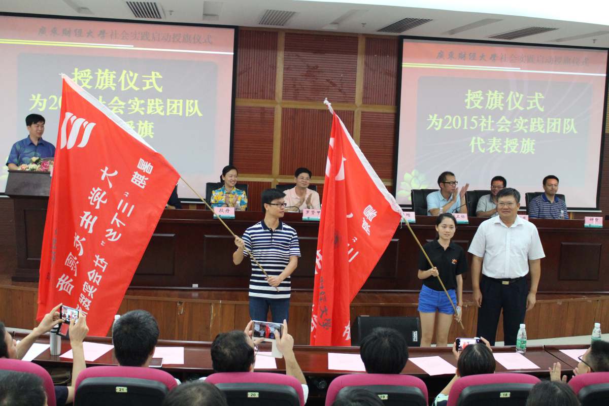 7月14日下午,广东财经大学2015年大学生暑期社会实践启动授旗仪式在佛山校区图书馆学术报告厅举行。校党委副书记吴琦、相关部门负责人、三水校区党委和各学院党委学生工作负责人、校团委全体委员、学生团队代表等近四百名师生参加会议。