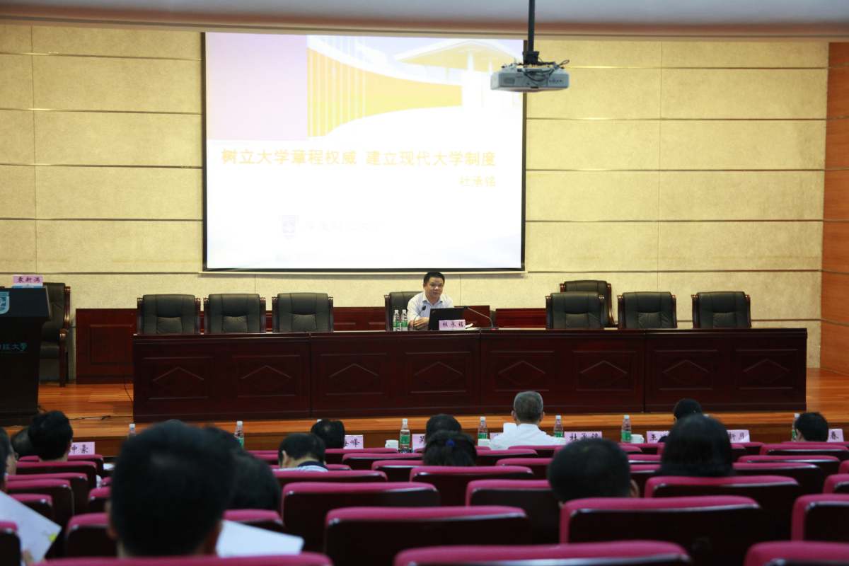7月15日下午,校党委理论学习中心组在综合楼408学术报告厅召开“依法治国、依法治教、依法治校”专题学习扩大会议,校党委理论学习中心组成员,全体中层干部参加会议。校党委中心组副组长、副书记袁新满主持会议,法学教授、学校章程起草小组副组长、副校长杜承铭做题为“树立大学章程权威,建立现代大学制度”辅导报告。