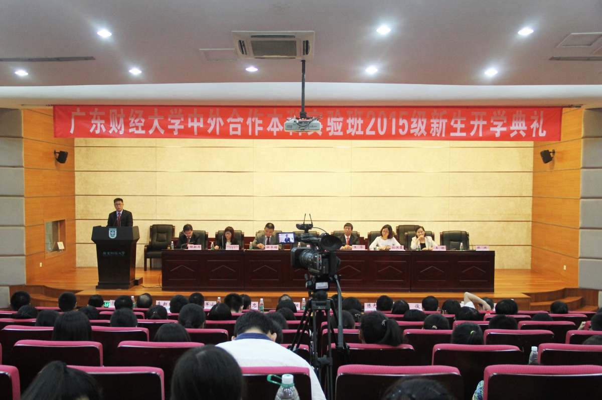 9月19日上午,广东财经大学中外合作本科实验班2015级新生开学典礼在广州校区综合楼408会议厅举行。澳大利亚澳中国际文化交流协会会长苏康华,教育部中国教育国际交流协会主任孙洪墨、协会“1+2+1”中美人才培养计划项目总监王颖,我校校长王华,副校长杜承铭、邹新月,以及经济贸易学院院长林洪、国际交流处处长李新博等相关学院、部门负责人出席典礼。杜承铭主持典礼。