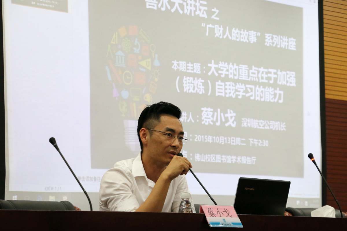 10月13日下午,“善水大讲坛”之“广财人的故事”系列讲座在广东财经大学佛山校区图书馆学术报告厅举行。我校2001级工商管理学院校友、深圳航空公司机长蔡小戈与校区师生分享了他的学习经历。