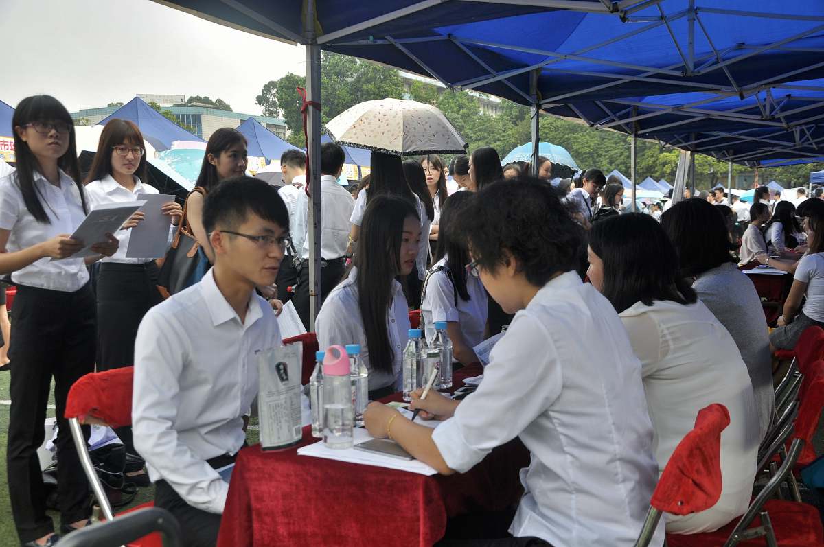 来校招聘的企业共有116家,金融、商贸、投资公司占主场,还包括教育、科技类公司。其中国美电器、欧派家居集团和农村商业银行等知名企业,吸引了大量学生前来求职。南方人才网负责人介绍本次招聘会说,相比以往招聘会的不同点,就是这次设立了微信平台提供给学生在网上投简历并可以进行网上面试,只要扫二维码进入界面操作即可,打破了空间和时间的局限,为没空参加招聘会的学生提供了便利。