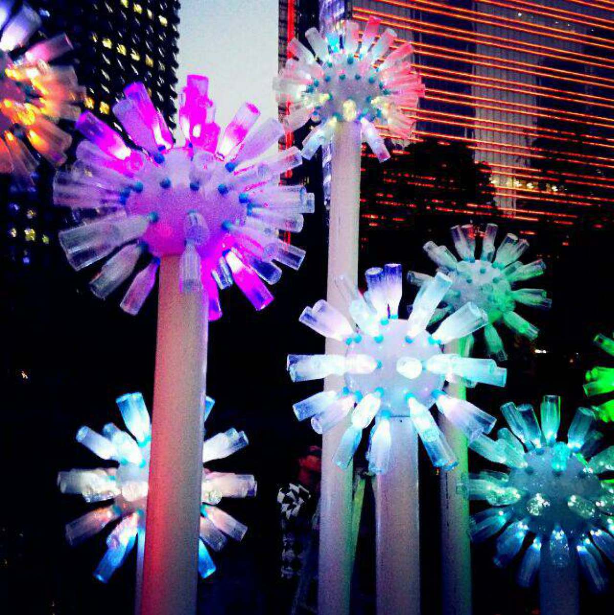 《粤风·灵动》作品创作灵感取自于大自然中的蒲公英,仿以蒲公英的球状花朵为外观造型,结合场地环境因素进行组合设计,置于城市广场的人工湖中,水影相辉映。作品以回收的饮用水塑料瓶、亚克力管为主要材料,按放射状组合成蒲公英造型,内置LED灯光照明设备,通过COB控制灯光效果,忽明忽暗缓缓光影波动,外置红外传感设备实现与观众无隔阂地互动。当观众路经作品前面的感应区域,轻轻的移动与轻拂,蒲公英花球般的灯体灯光波动,如蒲公英被徐徐吹开、零散在羊城的夜空中。观众通过与之互动,体验原生态的真、善、美,传递生态保护的科学意识和倡导天人合一和谐共存的价值观念。