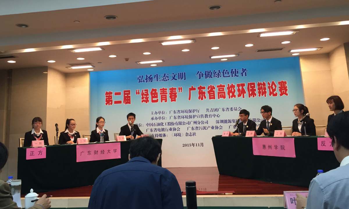 第二届“绿色青春”广东省高校环保辩论赛由省环保厅、团省委联合举办,来自全省32所高校的代表队在半个月内共进行5轮比赛。赛场上辩手们唇枪舌战、精彩纷呈,展示了当代大学生对环境问题的关注与理解,为观众带来了一场环境文化盛宴。我校队员围绕“生活垃圾不分类投放是否应该罚款”、“是否应该立法要求排污企业购买环境污染责任险”、“‘先污染后治理’是否发展中国家经济起飞的必由之路”、“一定的物质条件是否环保的前提”等当前环保热点问题展开激烈辩论。