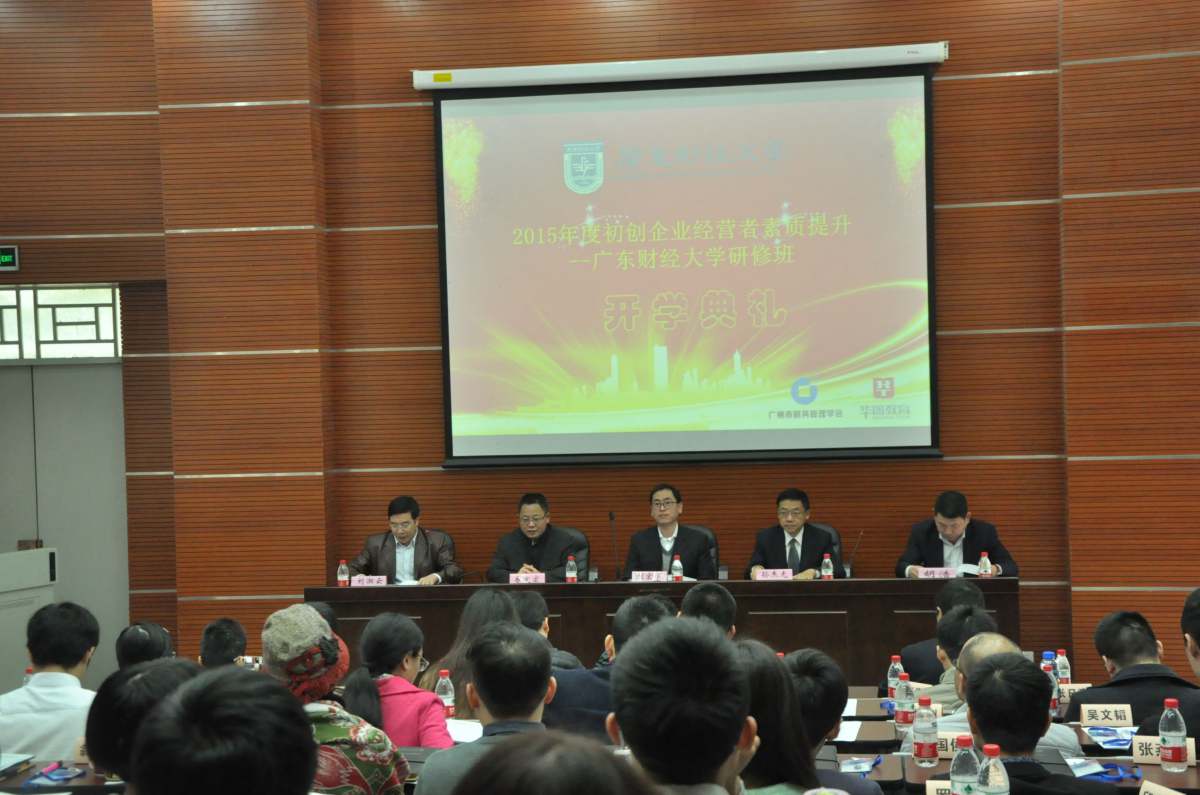 12月12日上午,2015年初创企业经营者素质提升广东财经大学研修班开班仪式在广州校区举行。广东省人力资源和社会保障厅相关负责人,我校副校长杜承铭,北京华图宏阳教育文化发展有限公司总裁易定宏,吉林省人才交流开发中心大学生创业培训处处长胡浩,长春金融高等专科学校党委书记孙杰光及创业教育学院院长高同彪,广州市财务管理学会副会长唐斌,广州艾晨斯品牌策划有限公司总经理吴志伟,我校创业教育学院党总支书记王德斌、部分任课教师和全体研修班学员参加。创业教育学院院长刘湘云主持仪式。