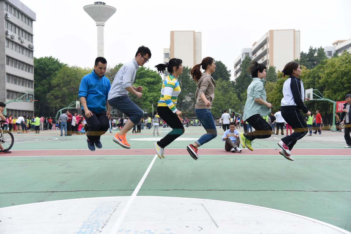 大赛以“我运动,我健康,我快乐”为主题,分为毽球颠球比赛、往返运球投篮接力比赛和跳大绳比赛三个项目。其中跳大绳比赛需要六名队员同时起跳、互相配合,老师们身姿轻盈稳健,球场上不时传来欢声笑语。