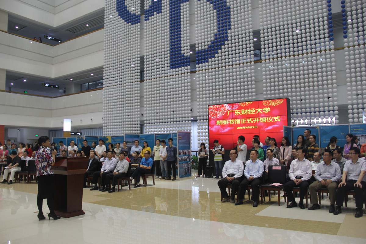 自上学期末,广州校区新图书馆已开始试运行,到过新图书馆的师生都给予高度评价。在进一步完善服务后,4月22日,“广东财经大学新图书馆开馆仪式”在新馆二楼服务大厅隆重举行。校党委书记黄晓波,校长王华,校党委副书记袁新满、吴琦,副校长王廷惠、陈国栋,图工委委员、各有关职能部门主要负责人、校友代表、教师代表以及学生代表等出席开馆仪式。图书馆馆长尹恩山主持仪式。