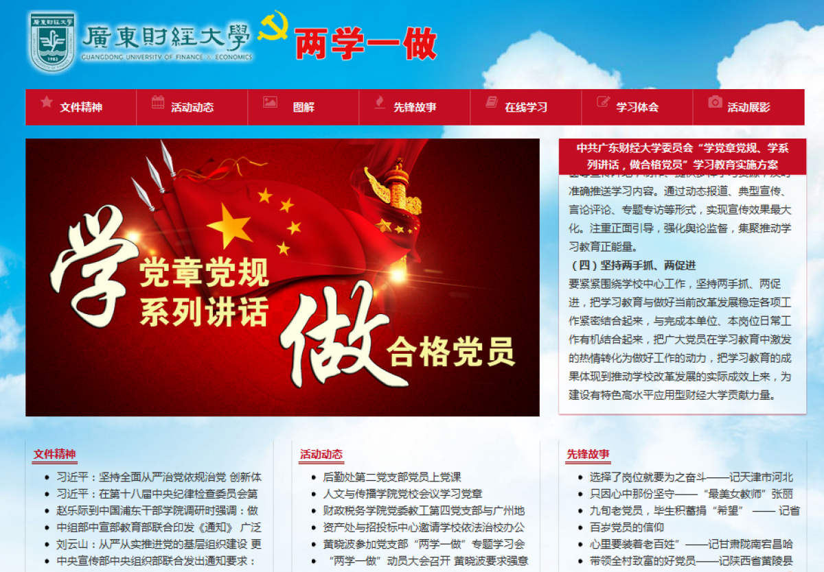 按照中央、省委有关要求和学校工作部署,经过近两个月的页面设计、修改完善、程序调试和试运行,由党委宣传部负责建设的学校“两学一做”学习教育专题网(http://lxyz.gdufe.edu.cn/)日前正式上线。