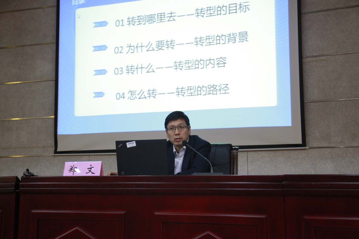 郑文在报告中首先介绍了应用型转型试点高校遴选的过程。他指出,试点高校遴选是教育厅依据各高校创新强校工程考核结果和转型试点方案评选出的,能成为转型试点高校说明学校具备了较好的转型基础,是学校的荣誉。随后他从转型的目标、背景、内容、路径四个方面进行深入解读。他指出,应用型是大学的一种办学类型,不能与水平划等号,应用型、研究型大学都有水平的高低。应用型大学既不同于培养研究型人才的本科高校,也不同于培养技术技能型人才的高职高专,而是更加注重产学研融合、校政企协同,更加注重人才培养、科学研究与社会服务的深度融合,更加突出培养适应地方经济社会发展的应用型人才。高校向应用型转型是政府举办者的要求,是经济社会发展、高等教育发展、各地方高校发展的需要。他从办学定位、专业结构、人才培养目标、课程方案、培养模式、师资队伍、治理结构、科研方向等八个方面详细介绍了高校向应用型转型的具体内容。最后他指出,走服务地方经济社会发展、突出自身特色和竞争优势的转型之路才能在转型中有所作为。