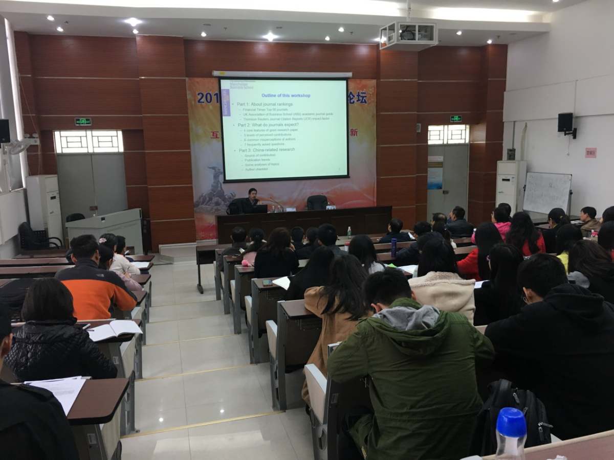 Edward Lee作题为“WhatAcademic Journals look for”的讲座,就SSCI国际期刊评审以及如何在国际期刊发表论文等问题与我校师生进行深入交流。EdwardLee首先介绍了目前主要的国际期刊分级标准,包括FT50、ABS以及SSCI影响因子分类标准等,比较了不同分级标准之间的异同及优缺点,从主编的角度对中国作者投稿如何选择目标期刊给出了相应建议。他认为,一篇好论文应该具备四个核心特征,即CORE(Contribution、Originality、Rigor和Exposition),对每个核心特征相应的内涵及要求作了详细解释,并阐述了一篇论文学术贡献的五个层级、作者容易出现的六个误区、七个经常被问到的问题等内容。最后,他针对如何开展中国主题研究进行了介绍,包括如何凝练中国主题研究的学术贡献、国际期刊发表中国主题论文的趋势、中国主题一些常见领域的讨论以及作者在最终投稿之前必须进行的检查清单。