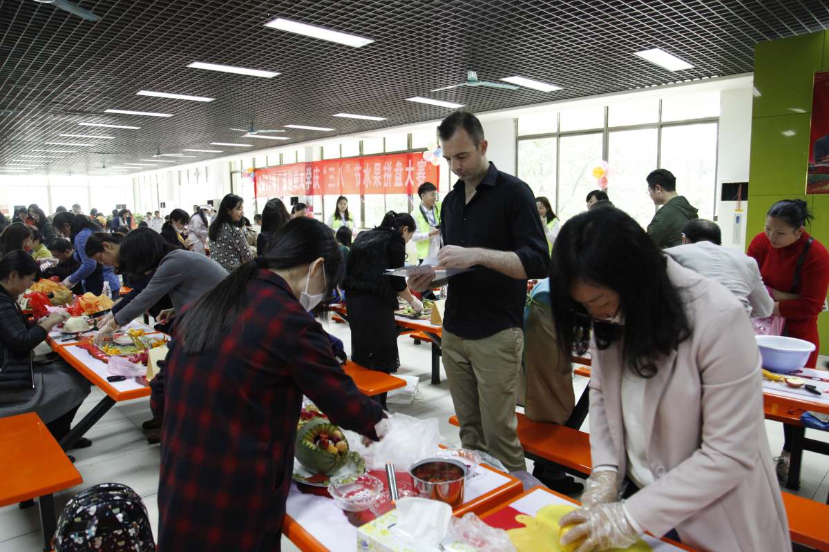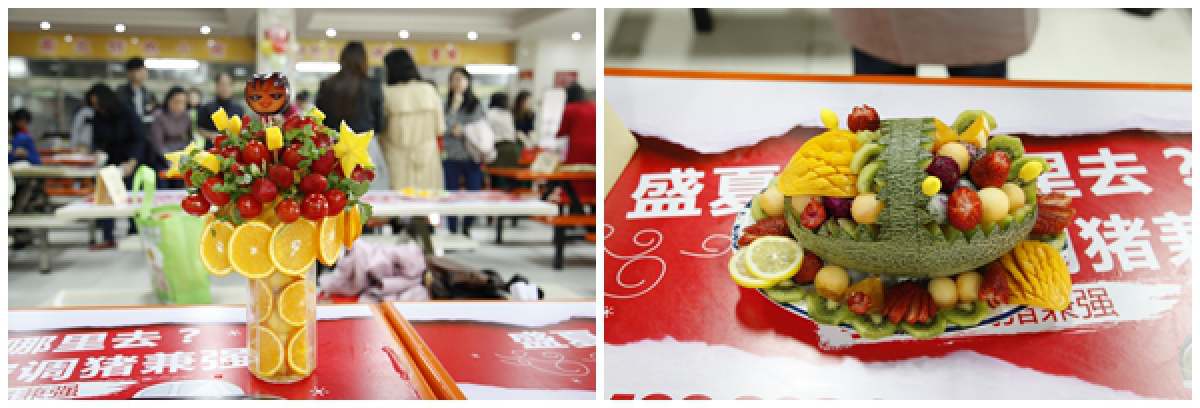 3月17日下午,我校教职工庆“三·八”节“果然缤纷”水果拼盘大赛在广州校区一饭二楼举行。这是我校首次举办教职工水果拼盘大赛,全校各单位共组织了34支队伍参赛。参赛选手用各种时令水果,运用切雕嵌摆等各种手法,围绕“广财”、“三八”、“春天”、“幸福”等主题精心创作、讲述故事。作品巧夺天工,充分展现了教职工们丰富的想象力和过人才艺,以及对生活、对工作、对学校的热爱。同时活动也对倡导健康绿色的饮食理念,丰富校园文化生活起到积极作用。