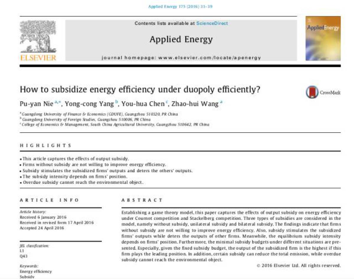 据ESI(Essential Science Indicators)3月10日最新统计数据,我校珠三角科技金融产业协同创新发展中心教授聂普焱2016年以第一作者发表于《Applied Energy》上的论文“How to subsidize energy efficiency under duopoly efficiently?”入选ESI全球TOP 0.1%热点论文( Hot papers )。这是我校论文首次入选ESI全球“热点论文”,实现我校在ESI高被引论文、热点论文零的突破。
