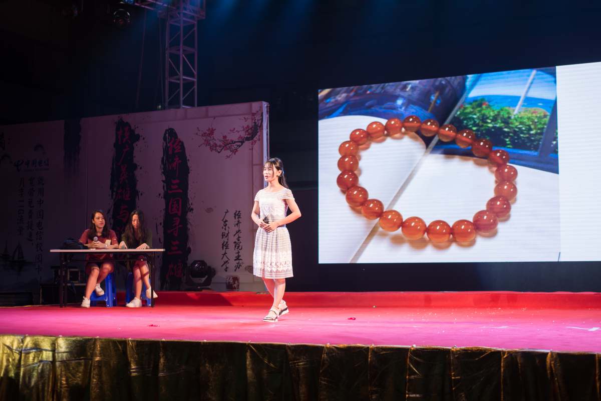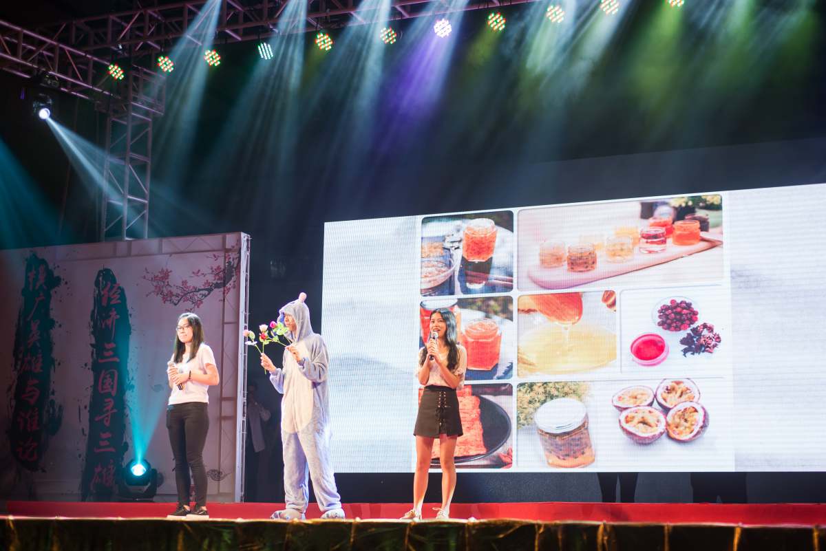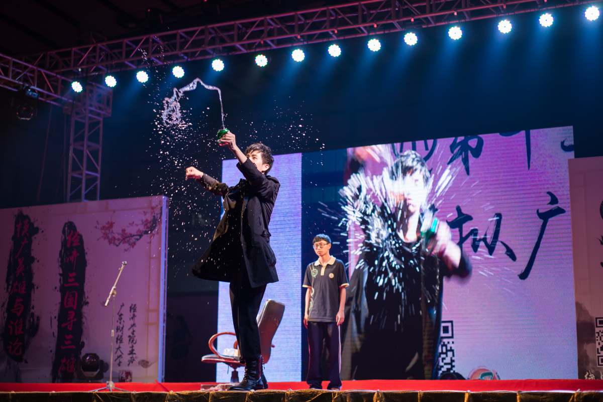 随后,魏国阵营的舞台剧《反转赤壁之战》率先登场,四支队伍运用经典的广告台词,配合幽默元素,上演了赤壁之战的反转故事。经济学院声乐队带来歌曲演唱《Diamonds》。15级同学聂启昊表演了“手帕变扇子,转移饮料气泡”的精彩魔术。吴国阵营的DLEP团队以走秀、歌伴唱的形式展示自己的服装产品,其中男扮女装的反转更是引得观众笑声连连。蜀国阵营表演脱口秀节目《蜀留香》。经济学院和金融学院组成的礼仪队带来了产品走秀表演,12个参赛队伍的代表物品分别由12个模特依次展示。国标队《永恒的爱》、双冰组合《突然好想你》、民舞队《梦飞扬》等压轴表演为晚会划下句号。