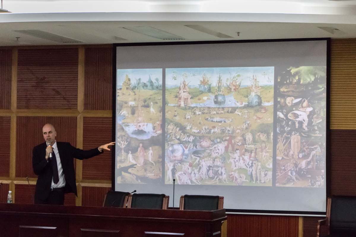 Andrew Pidoux带领大家领略了西方宗教特色建筑与西方著名艺术家风采。展示阿雷纳礼拜堂的内景时,他讲述了每一幅壁画背后的宗教故事,并引入同时期中国书画家马远的作品论证二者在宗教元素上的差别;提及15世纪荷兰画家希罗尼穆斯·博斯名作《乐园》,他详尽解释了画中场景、奇幻生物的含义;谈到梵高,他结合梵高的生平剖析其画作《星空》中各意象的来源。