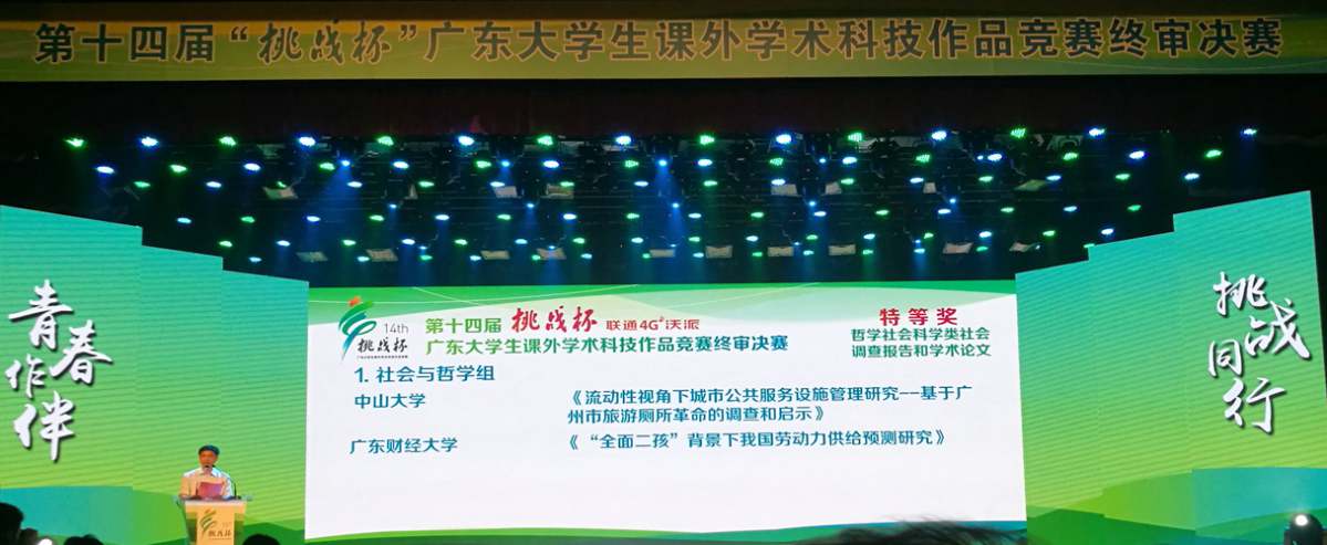 6月9日至11日,第十四届“挑战杯”广东大学生课外学术科技作品竞赛终审决赛在广州举行。我校共有16件作品获奖,其中《“全面二孩”背景下我国劳动力供给预测研究》、《征地诱发的社会冲突解构与当代维稳研究——以梅州市黄龙村与双璜村为例》、《中国商业保理法律制度建设与实践调研报告--基于“广深珠”试点现状 》、《“双创”背景下双创债的经济效应与风险管控研究》4件作品获特等奖,另有1件作品获一等奖、7件作品获二等奖、4件作品获三等奖,特等奖获奖数继第十三届省赛取得突破后再创新高。