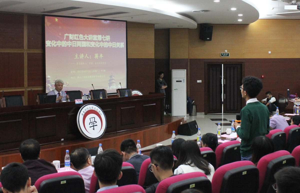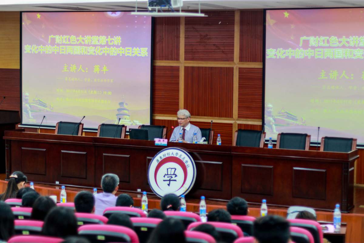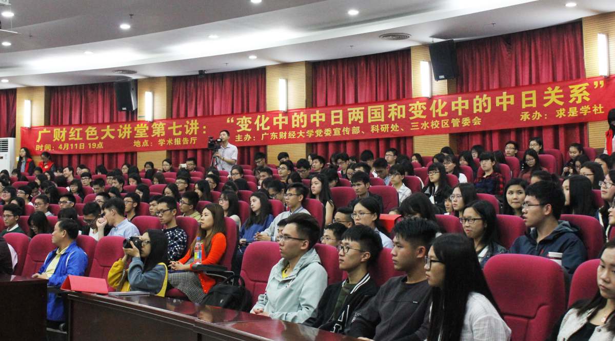 4月11日晚,“广财红色大讲堂”第七讲在佛山三水校区图书馆学术报告厅举行。《人民日报海外版》日本月刊总编辑、《日本新华侨报》中文版总编辑,被称为“评介日本第一人”的旅日社评作家蒋丰做客我校,畅谈“变化中的中日两国和变化中的中日关系”。近四百名师生聆听讲座,座无虚席。校党委宣传部部长罗贤甲主持讲座。