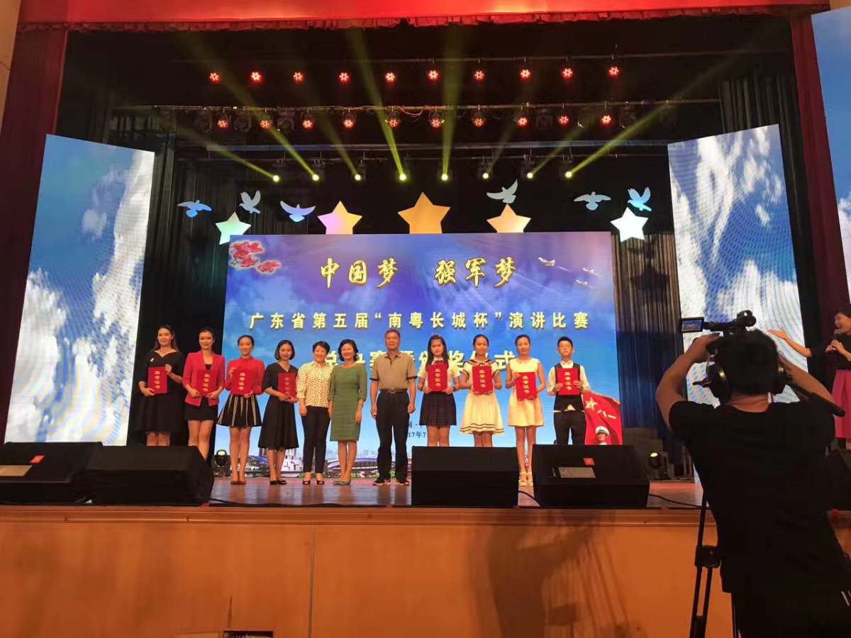 7月28日下午,广东省第五届“南粤长城杯”演讲比赛总决赛暨颁奖仪式在南部战区礼堂举行。我校人文与传播学院2014级播音与主持艺术专业徐颖青同学获得大赛一等奖,这是我校播音与主持艺术专业学子连续第三年获此佳绩。