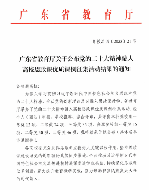 近日,广东省教育厅公布了“党的二十大精神融入高校思政课优质课例征集活动”评选结果 ...