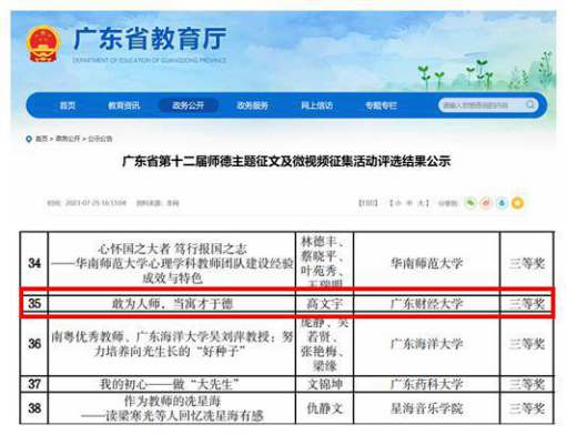近日,广东省教育厅公布了《广东省第十二届师德主题征文及微视频征集活动评选结果》。 ...
