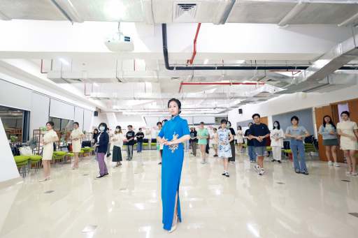 5月23日晚,图书馆801多功能培训室里,博古架、油纸伞,团扇、绿植,莲花、月季 ...