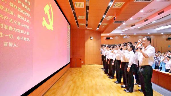 “我志愿加入中国共产党,拥护党的纲领,遵守党的章程,履行党员义务,执行党的决定,严守党的纪律……”会议伊始,新党员入党宣誓仪式举行,18名新党员代表列队上台进行入党宣誓。在校党委书记郑贤操的带领下,全体党员起立,面向党旗,举起右拳,重温入党誓词,为共产主义奋斗终身的宣誓声铿锵有力,响彻会场。