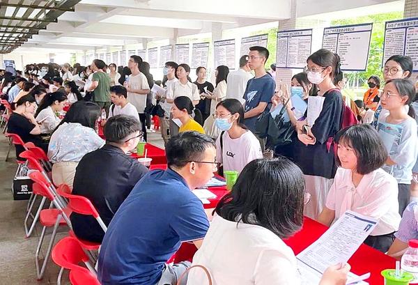 广州的夏日炎热异常,但不少企业摊位前早早便排起了长龙,同学们丝毫未受到高温影响,奔走寻找自己心仪的岗位,或投递简历或接受面试。