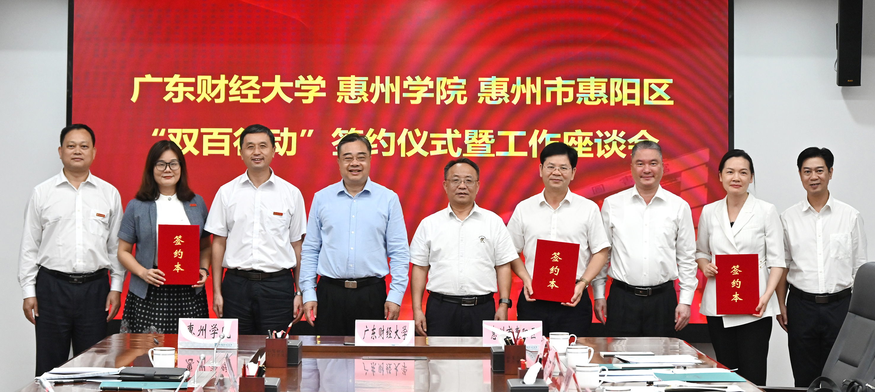 为贯彻落实省委“百千万工程”工作部署,深入推进“双百行动”各项工作,11月14日下午,我校与惠州学院、惠州市惠阳区“双百行动”签约仪式暨工作座谈会在同德楼第一会议室顺利举行。校党委书记郑贤操、校长于海峰、党委副书记罗贤甲,惠州学院校长王胜、党委副书记车小真,惠州市惠阳区区长何国斌、副区长何金华出席仪式。我校党办校办、组织部、社会合作处、驻区服务队,惠州学院党政办、组织部、驻区服务队,惠阳区委区府办、教育局负责人等参加仪式。仪式由于海峰主持。