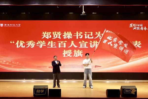 大会在激昂的国歌声中拉开帷幕。校党委书记郑贤操为“优秀学生百人宣讲团”代表授旗。2023-2024学年度,学校共有80名同学获国家奖学金,637名同学获国家励志奖学金,10名同学获校长奖学金,90名同学获校长奖学金提名奖,256名同学获院长奖学金,5641名同学获个人专项奖学金,75个班级获得“优良学风班”。学校将从以上受表彰的优秀学生中遴选代表组建“优秀学生百人宣讲团”,在校内进行先进事迹巡回宣讲。