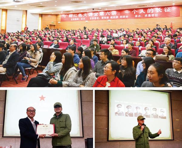 本报讯(记者 郑雯文 唐睿仙 曾湘棱)11月11日下午,由宣传部、组织部和科研处主办、求是学社承办的广财红色大讲堂第六讲——“一个人的长征”在综合楼408会议厅举行。摄影家、纪录片导演、中国新闻摄影金奖获得者左力讲述“一个人的长征”的故事,这也是他重走长征路后举办的第269场全国巡回演讲。校党委书记黄晓波主持讲座并为左力颁发客座教授聘书,校党委副书记袁新满、吴琦到会。