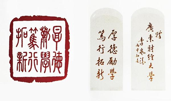 对于校训,原中共中央政治局常委、国务院副总理李岚清同志表示,“校训作为对学校办学理念的诠释和对师生修身治学的要求,在育人过程中发挥了重要的作用,是校园文化的精髓。”他强调,“社会主义核心价值观和德智体美的教育方针应当作为所有学校的总校训。”李岚清同志退休后篆刻了1000多所中国高校的校训。日前,他向广东部分高校赠送了刻有该校校训的印章。我校党委书记黄晓波代表学校接受了李岚清同志刻制的我校校训印章。