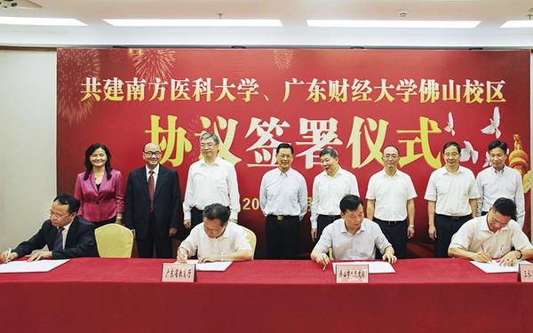 5月19日,广东省教育厅、佛山市人民政府、三水区人民政府与我校共建广东财经大学佛山校区协议签署仪式在佛山举行。省政府党组成员陈云贤,省政府副秘书长林积,省委教育工委书记、省教育厅党组书记、厅长景李虎,省教育厅党组成员、省教育考试院院长、省招生办主任王斌伟,佛山市委书记鲁毅、市长朱伟、副市长俞进,三水区委书记黄福洪,校党委书记黄晓波,校长于海峰,校党委副书记吴琦,副校长杜承铭、王廷惠、陈国栋等出席签约仪式。