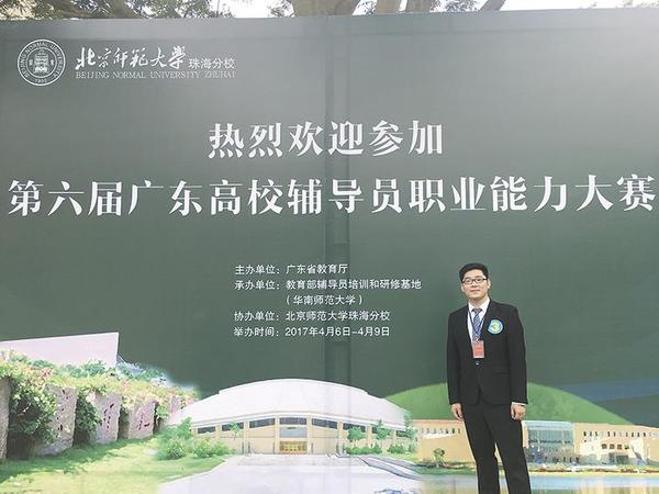 去年,黄敬聪在第六届全国高校辅导员职业能力大赛第四赛区复赛中获得了二等奖。辅导员职业能力大赛是辅导员平时工作经验与能力的一次集中检验与提升,是一个十分锻炼辅导员综合能力的平台,也是全省乃至全国辅导员之间交流的一次重要机会,黄敬聪为之付出了巨大的努力。本届大赛广东一共有248名选手报名,首次采用了淘汰制,通过主题班会与理论测试的成绩取前160名进入后面三个环节。准备期间,黄敬聪精心制作主题班会,利用工作之余进行复习。理论测试的范围十分广泛,涵盖了思政教育、学生心理教育、危机应对、法律知识等方方面面,整个比赛的准备过程以及参赛过程压力都十分大。黄敬聪说:“一方面,我缺乏足够的工作和比赛经验,另一方面就是准备的时间十分紧张。而压力最大的当属演讲。演讲环节可以根据个人喜好选择即兴或命题,即兴的压力来自于准备时间较短以及对于题目的不可预测性,而命题的压力在于破题,写稿以及背稿,基本要通宵达旦,然后第二天立即上台演讲,那种紧张程度是我所估计不到的。”所幸的是整个比赛期间,黄敬聪得到了许多人的帮助,比如学工部领导的培训与指导,教师发展与教育技术中心老师的场地与技术支持,学生干部的出谋划策、参与录制以及视频制作等,还有学工部教育科阮方明老师和智囊团所提供的丰富参考书目和复习资料。上台展示前,除了有队友之间的互相鼓励,也有庞大亲友团的支持与帮助。“亲友团的帮助,带给我一种踏实之感,也让我赢得了外校辅导员羡慕的眼神。”